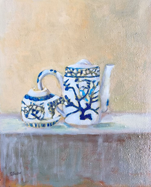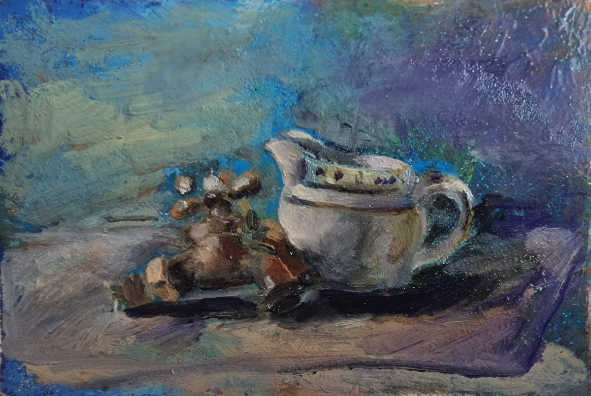 I dive into the 'flow' of what and where the piece wants to go. My preferred medium is oil on canvas usually, but can be adapted to paper. There’s a richness to the oils and during sessions, there’s a switch in my head and body when I let go, and the paint starts to flow like water, with the sound of the brush in total harmony with my hand and vision for the final piece. Some of the themes that recur is a fascination for cups, vessels any type of bowl or any receptacle.